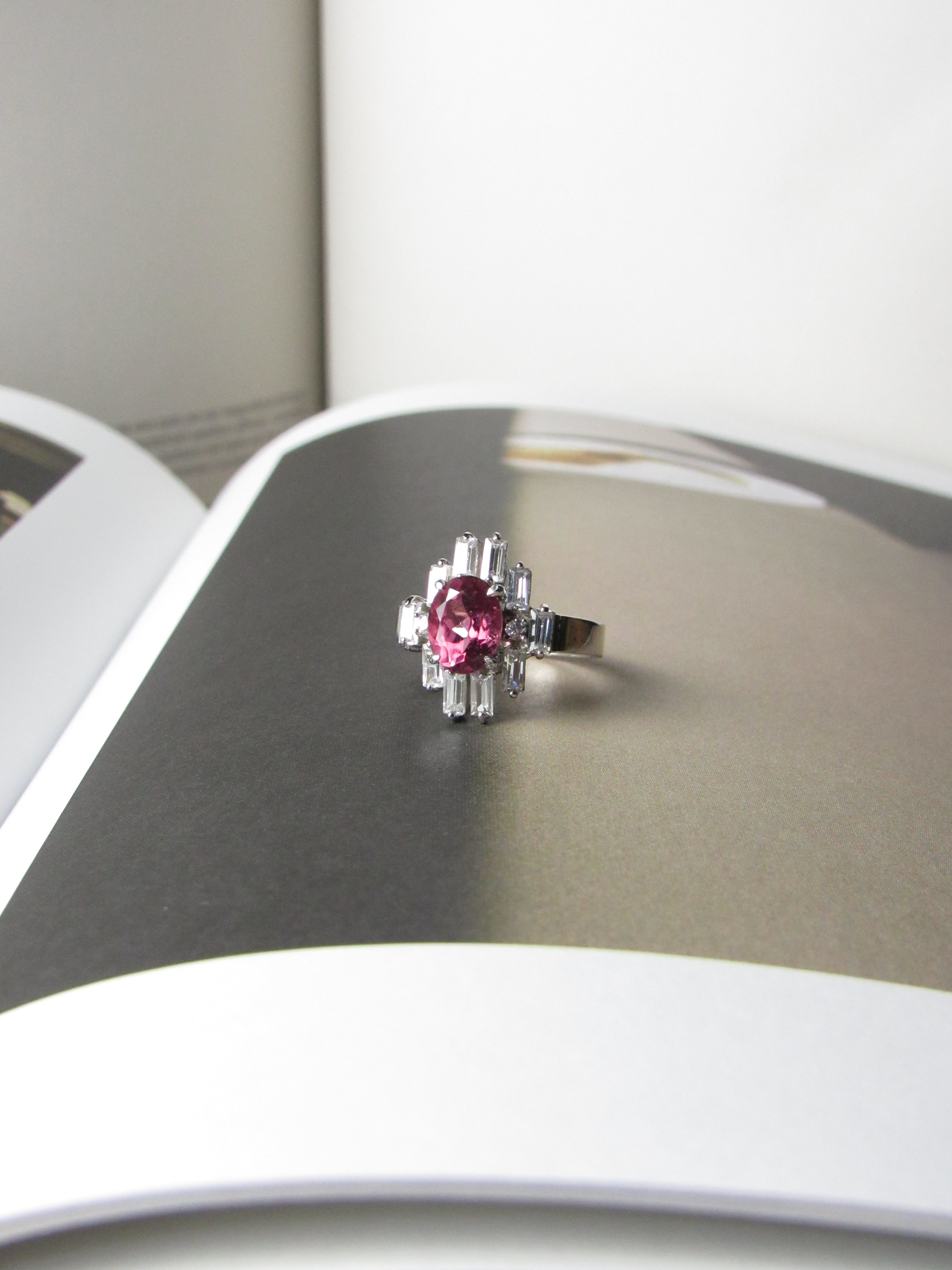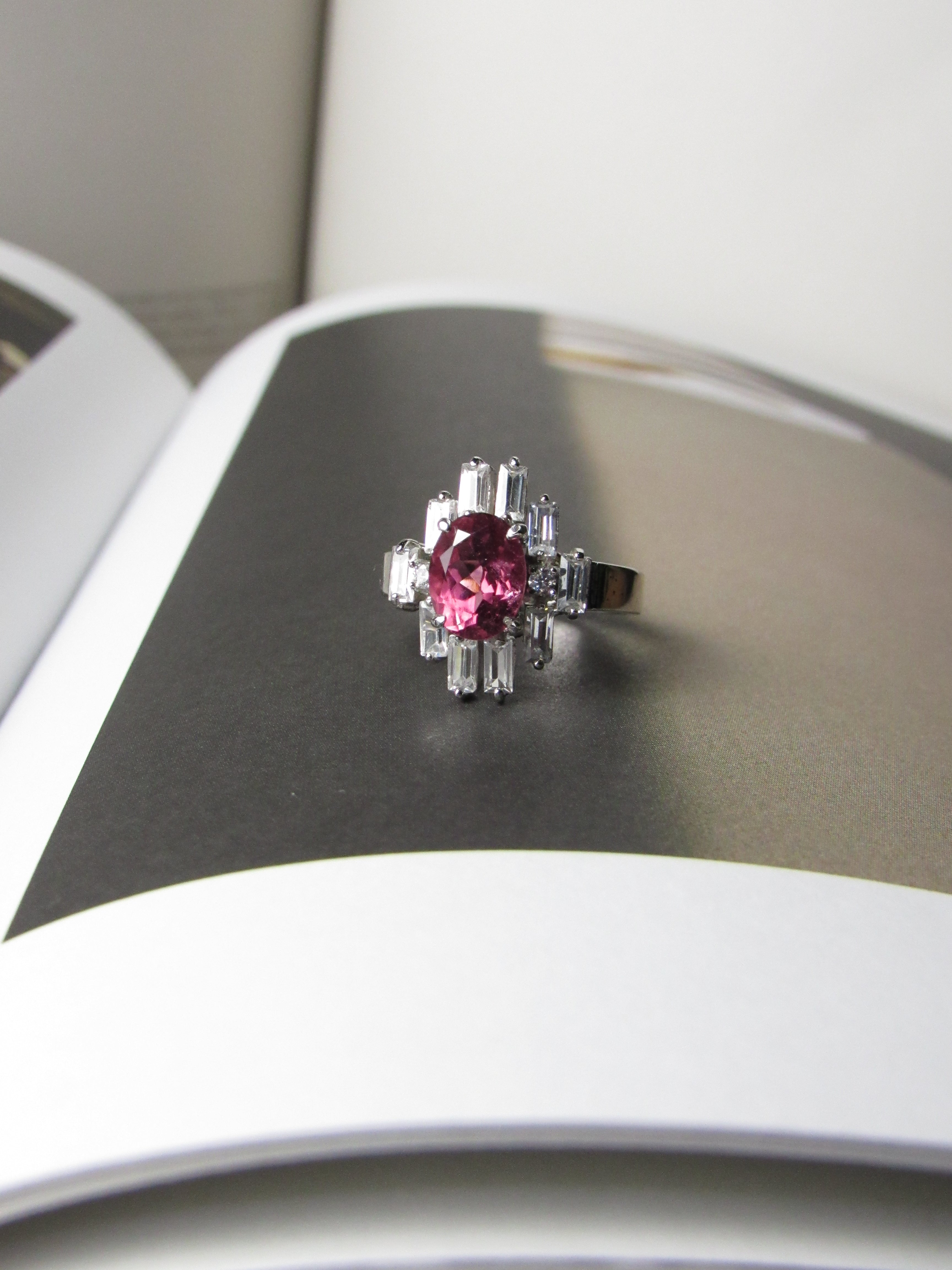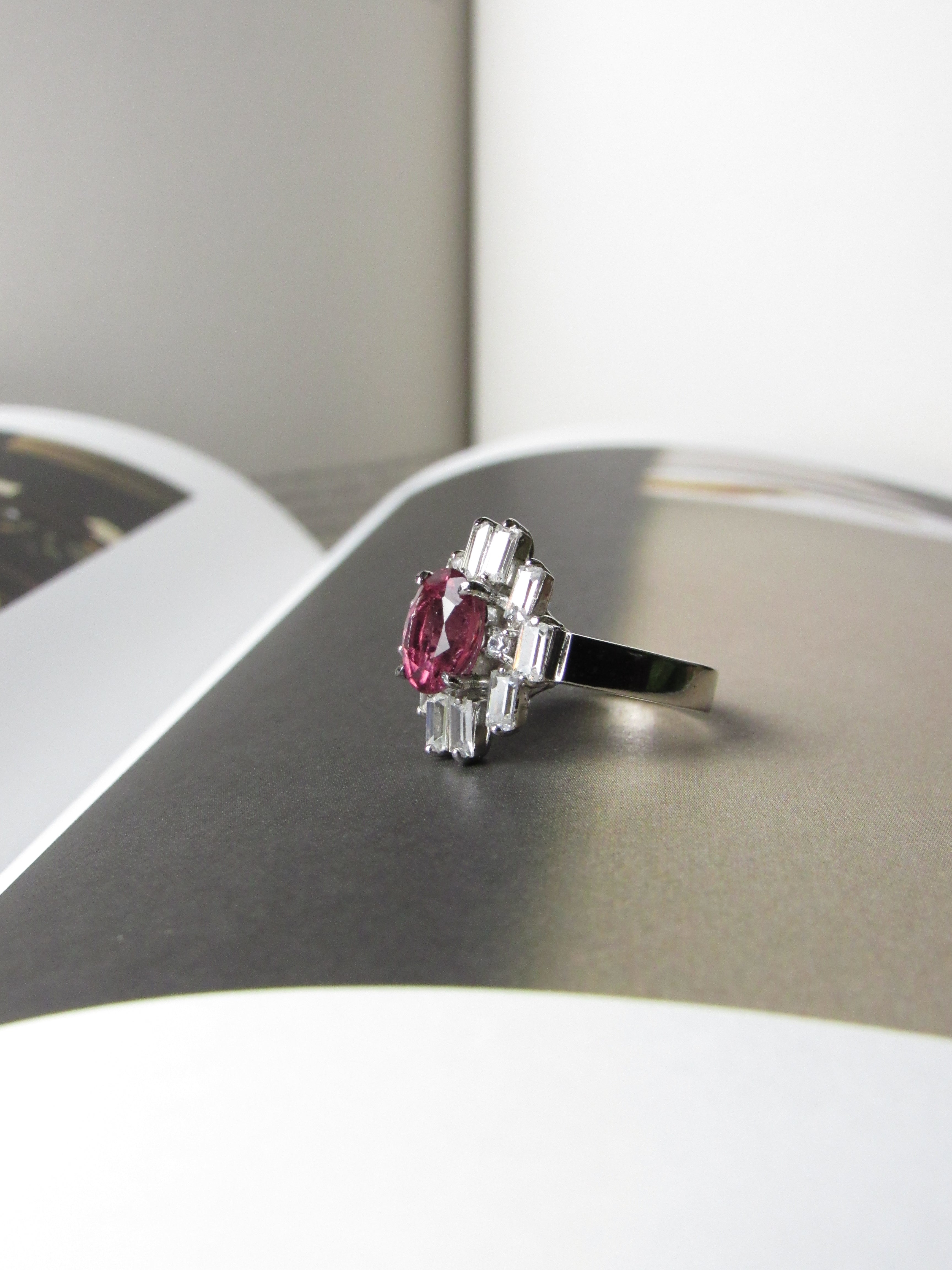 - Natural 3.5ct Oval cut Rubellite Tourmaline with accent baguette and round white sapphires