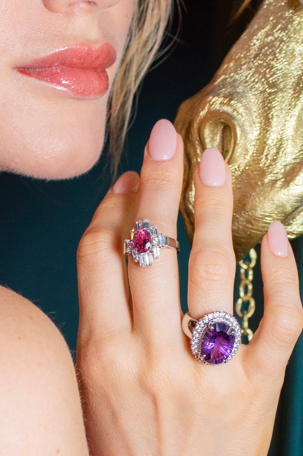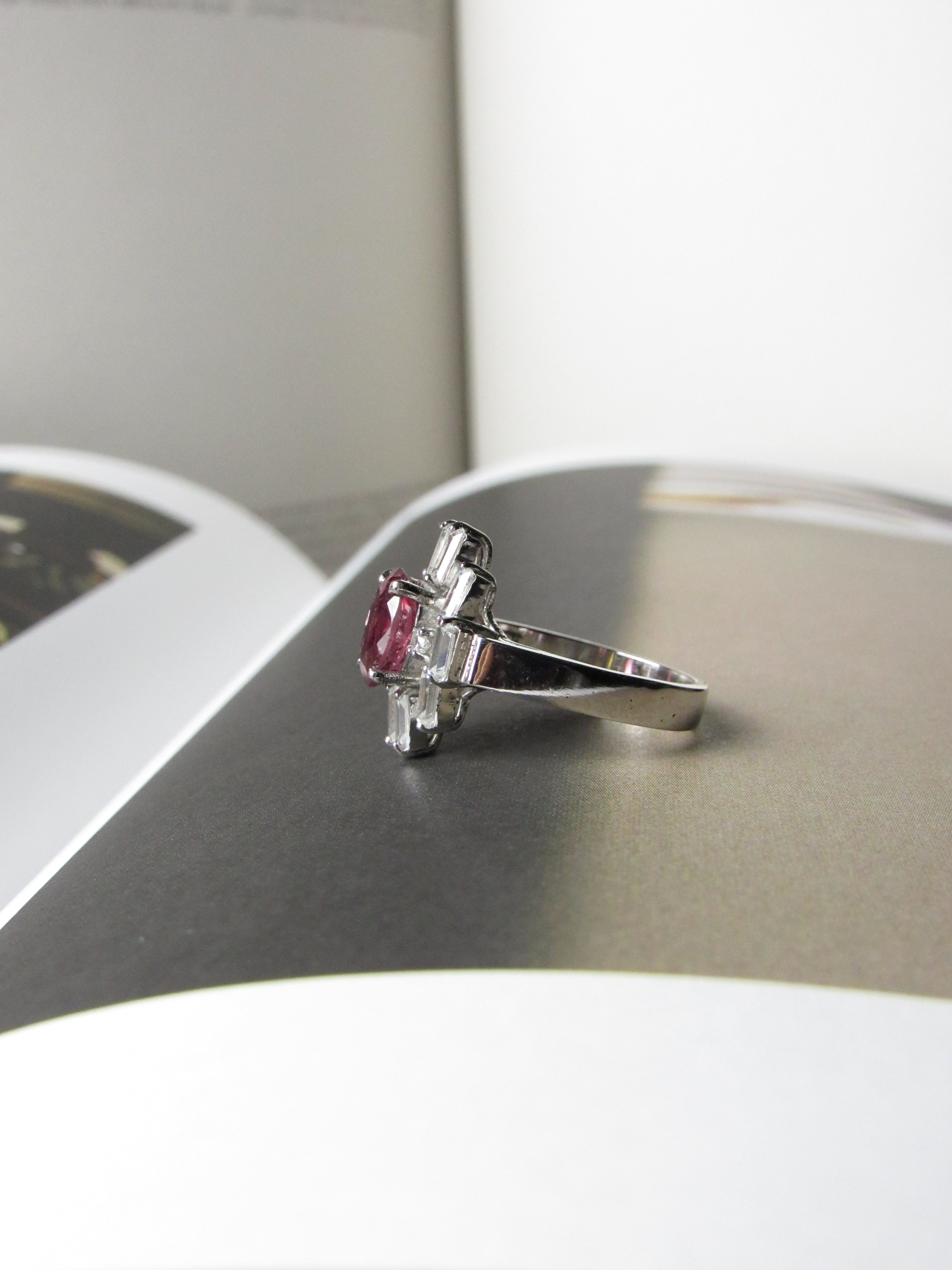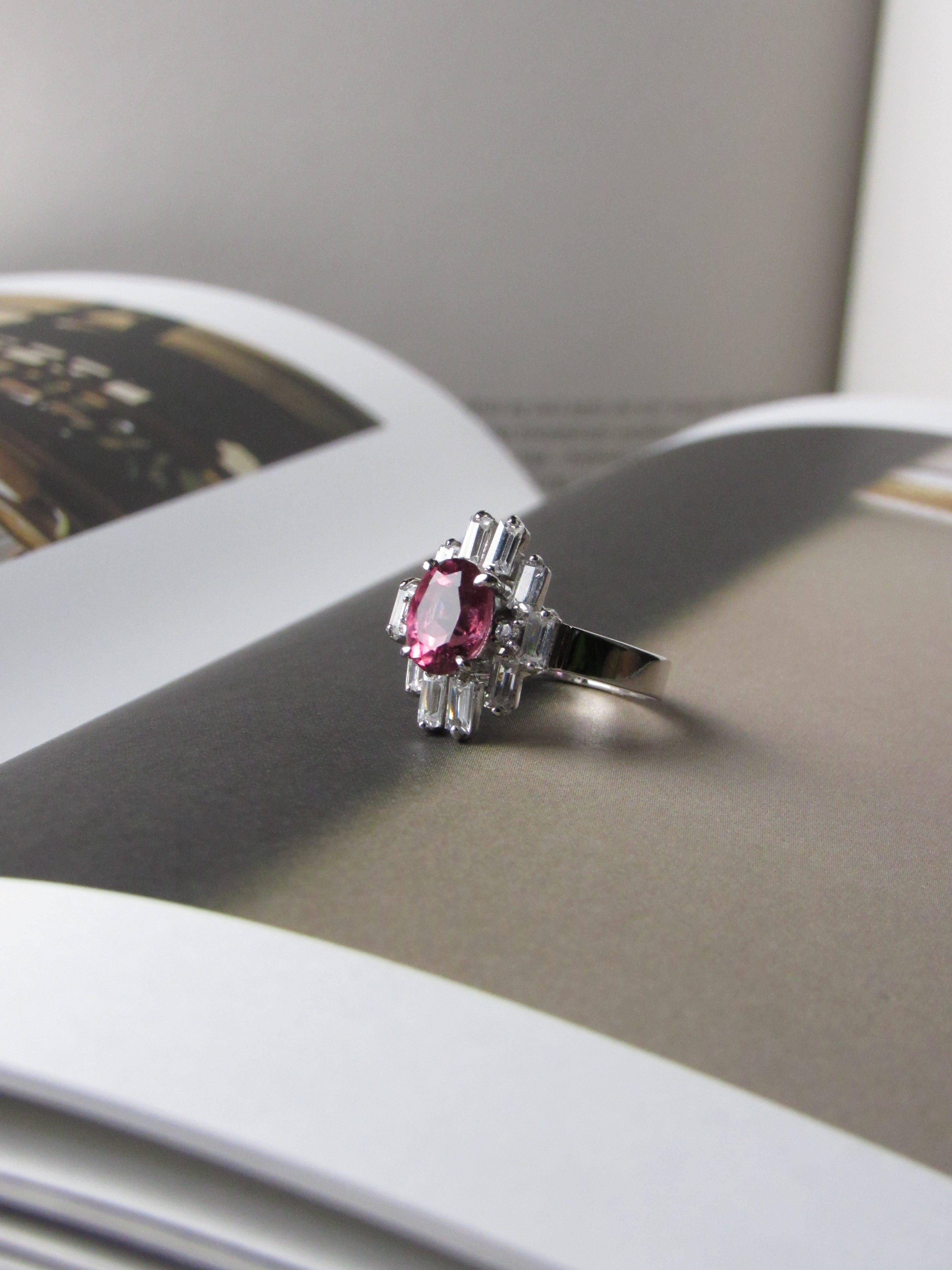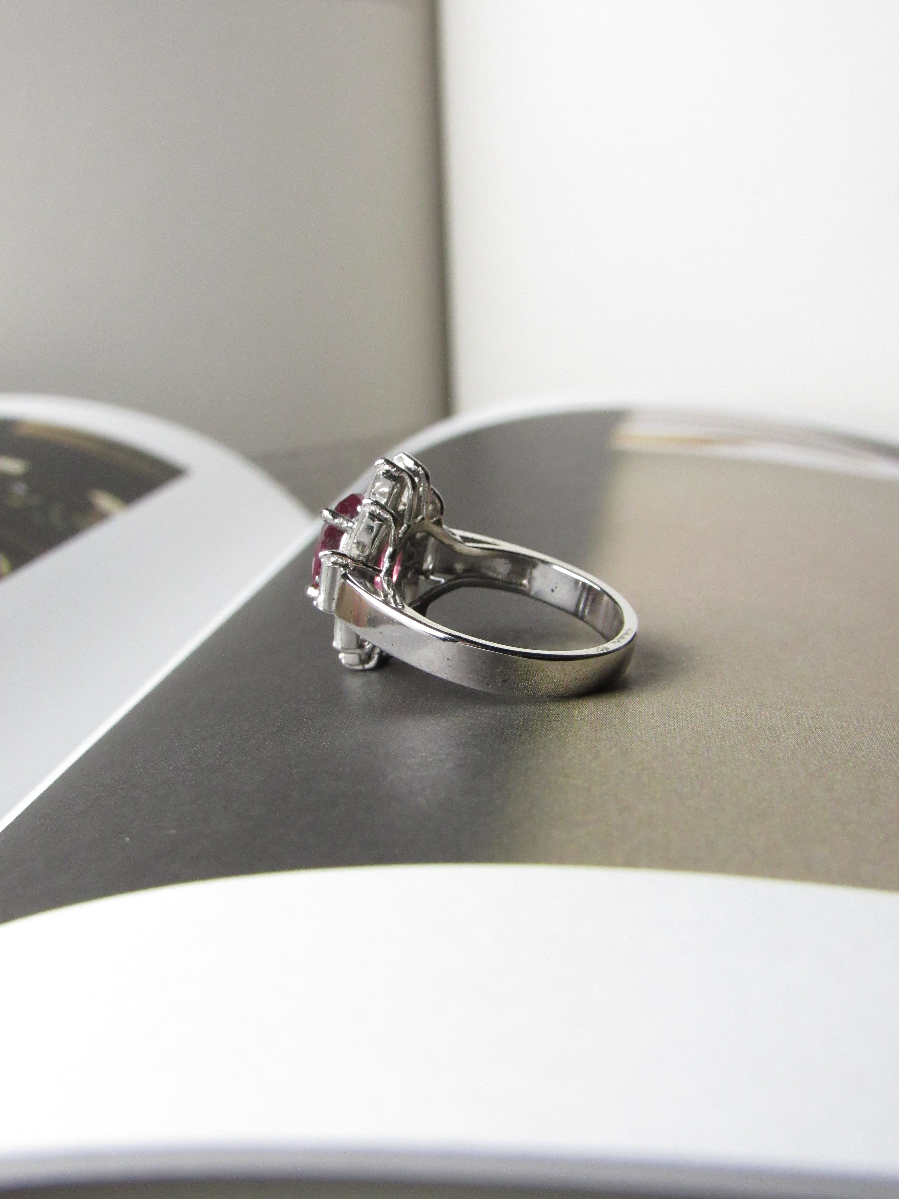 - Natural 3.5ct Oval cut Rubellite Tourmaline with accent baguette and round white sapphires