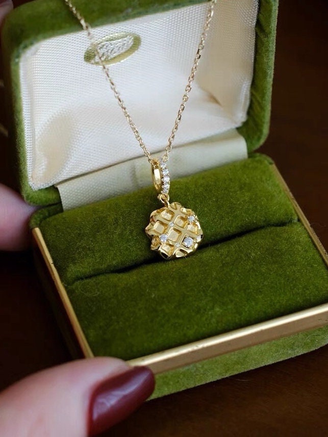 Step into playful luxury with our 18k Gold Waffle Pendant Charm. This whimsical piece combines precision craftsmanship with a delightful waffle design. The enhancer bail adds a dash of fun, making it the perfect accessory to spice up your style. Indulge in sophistication with a playful twist!