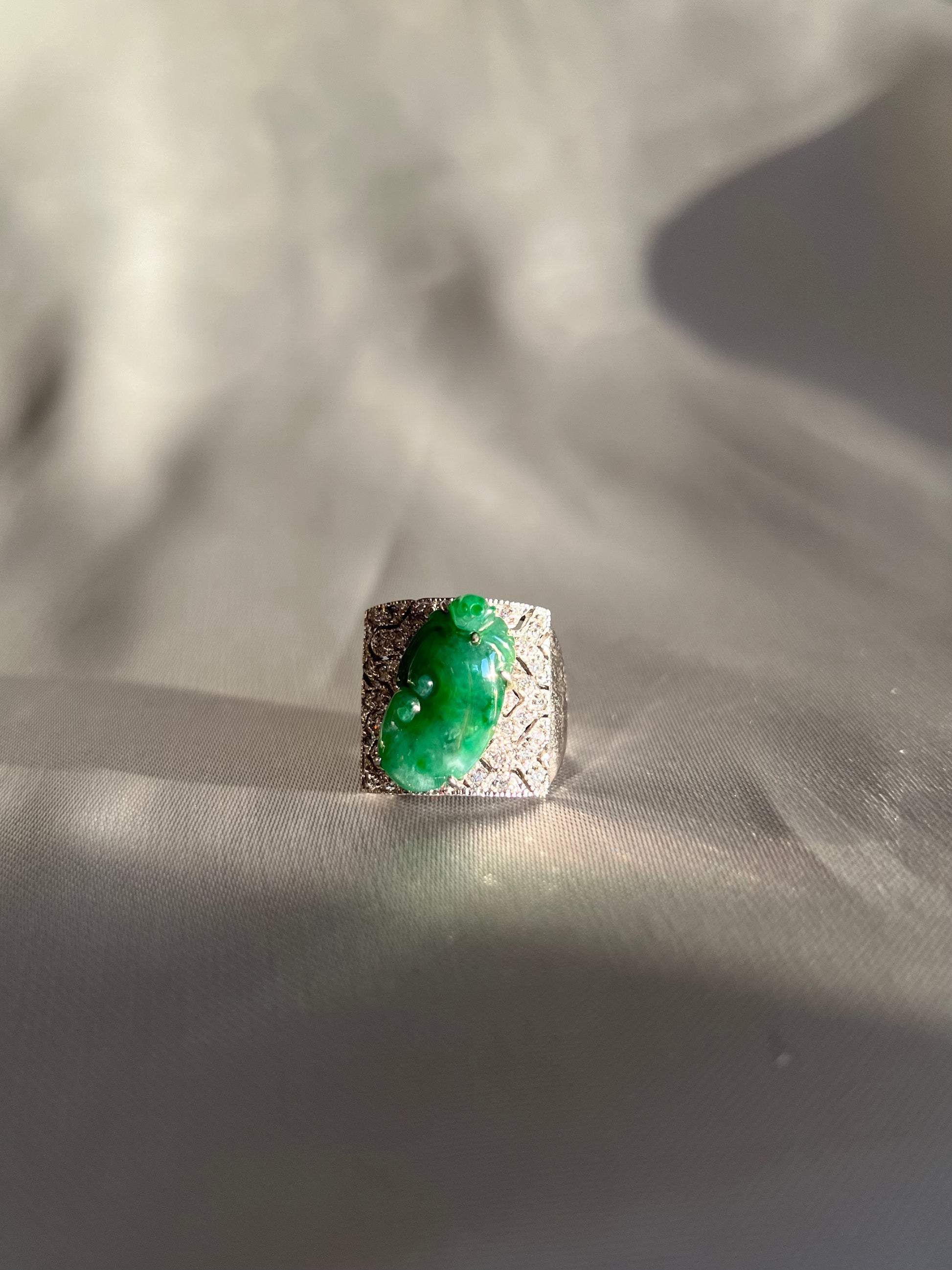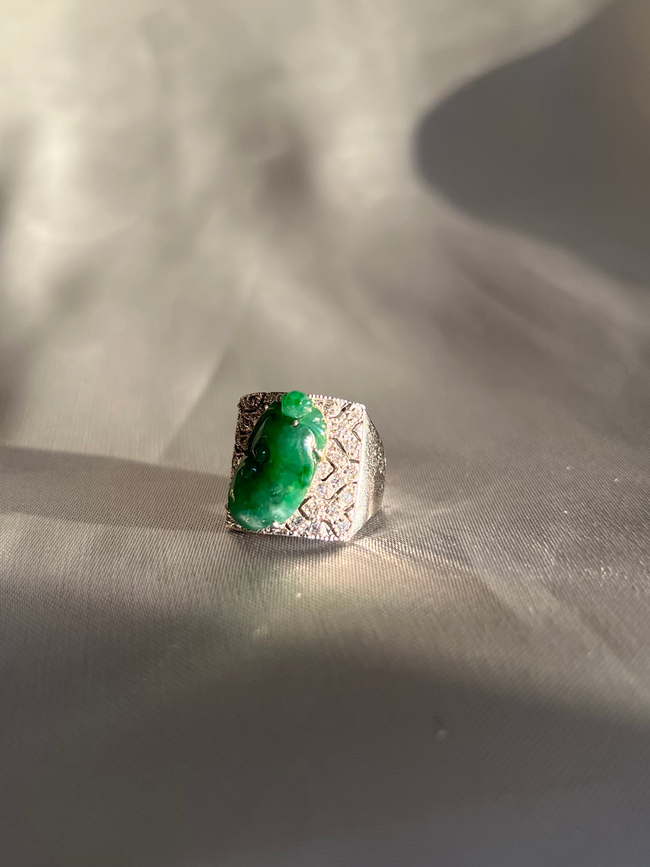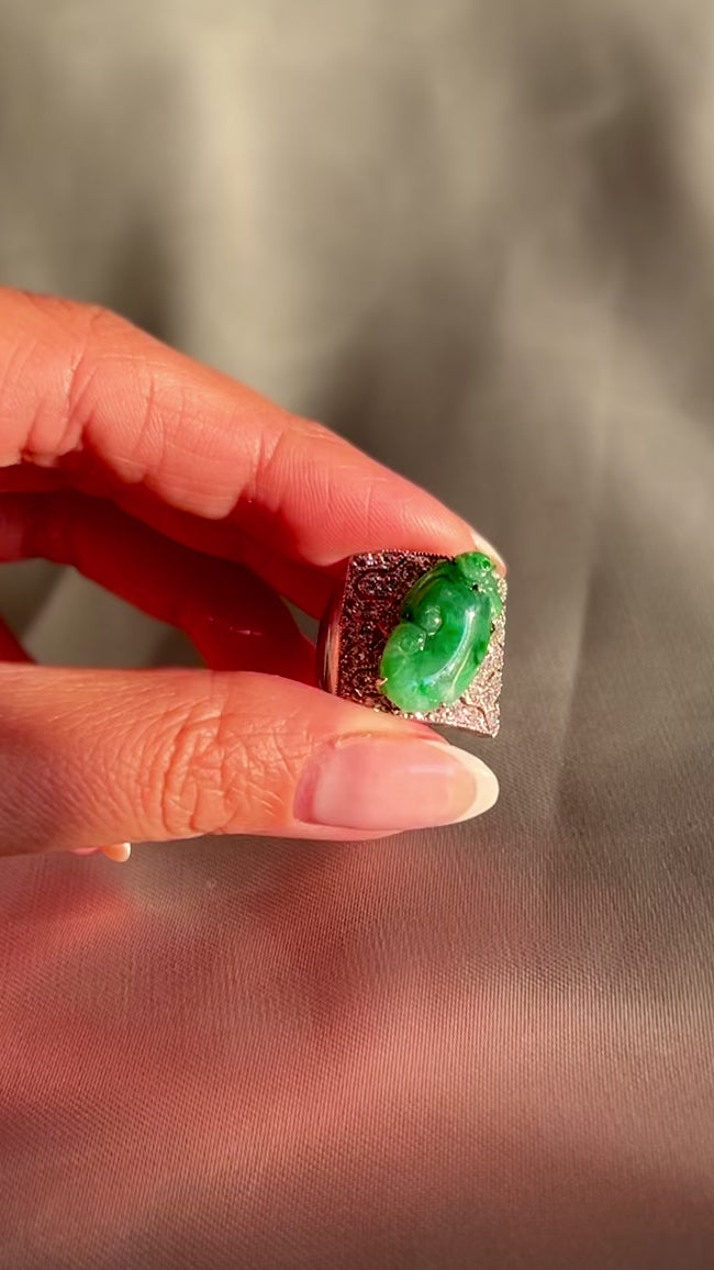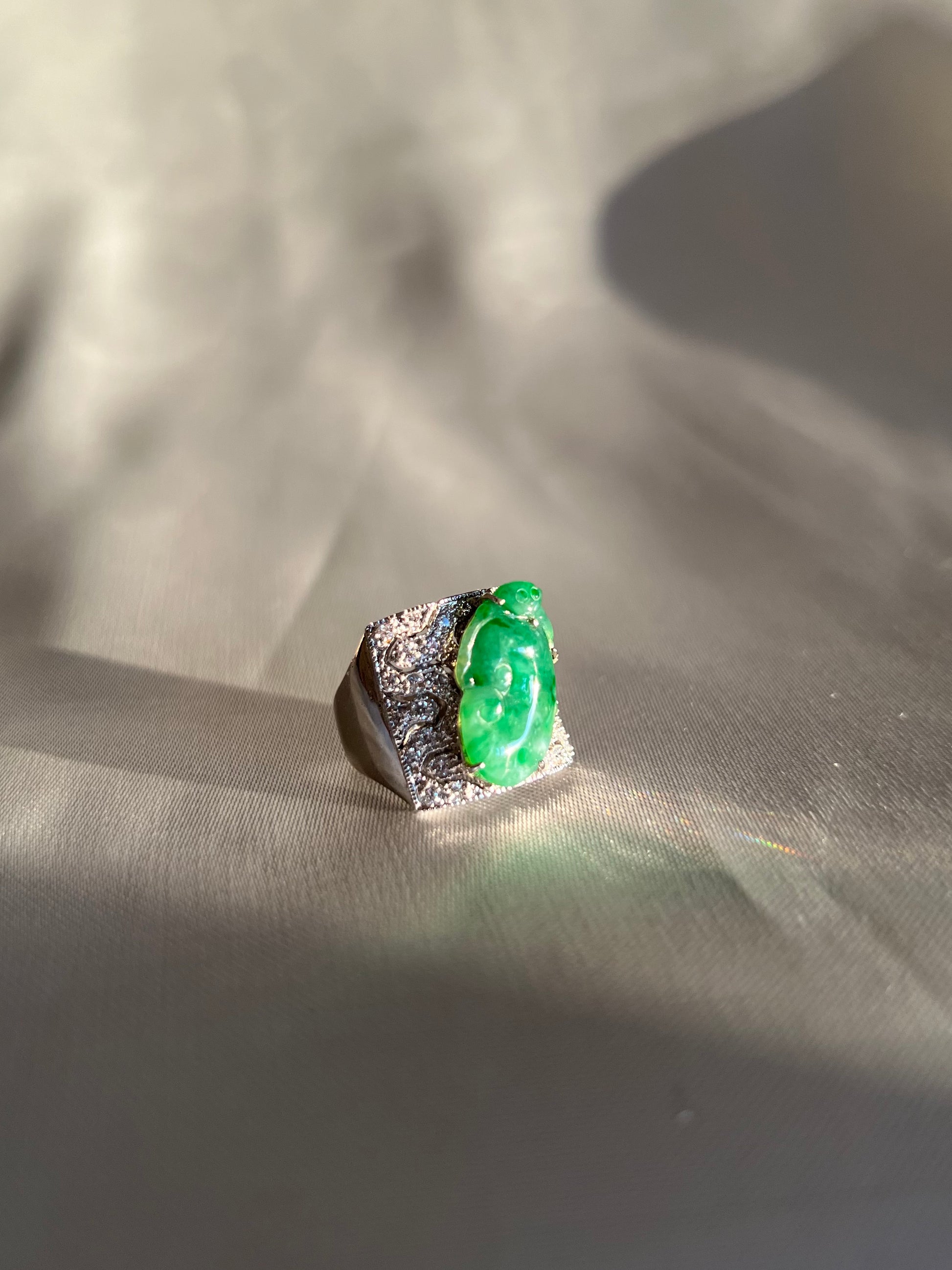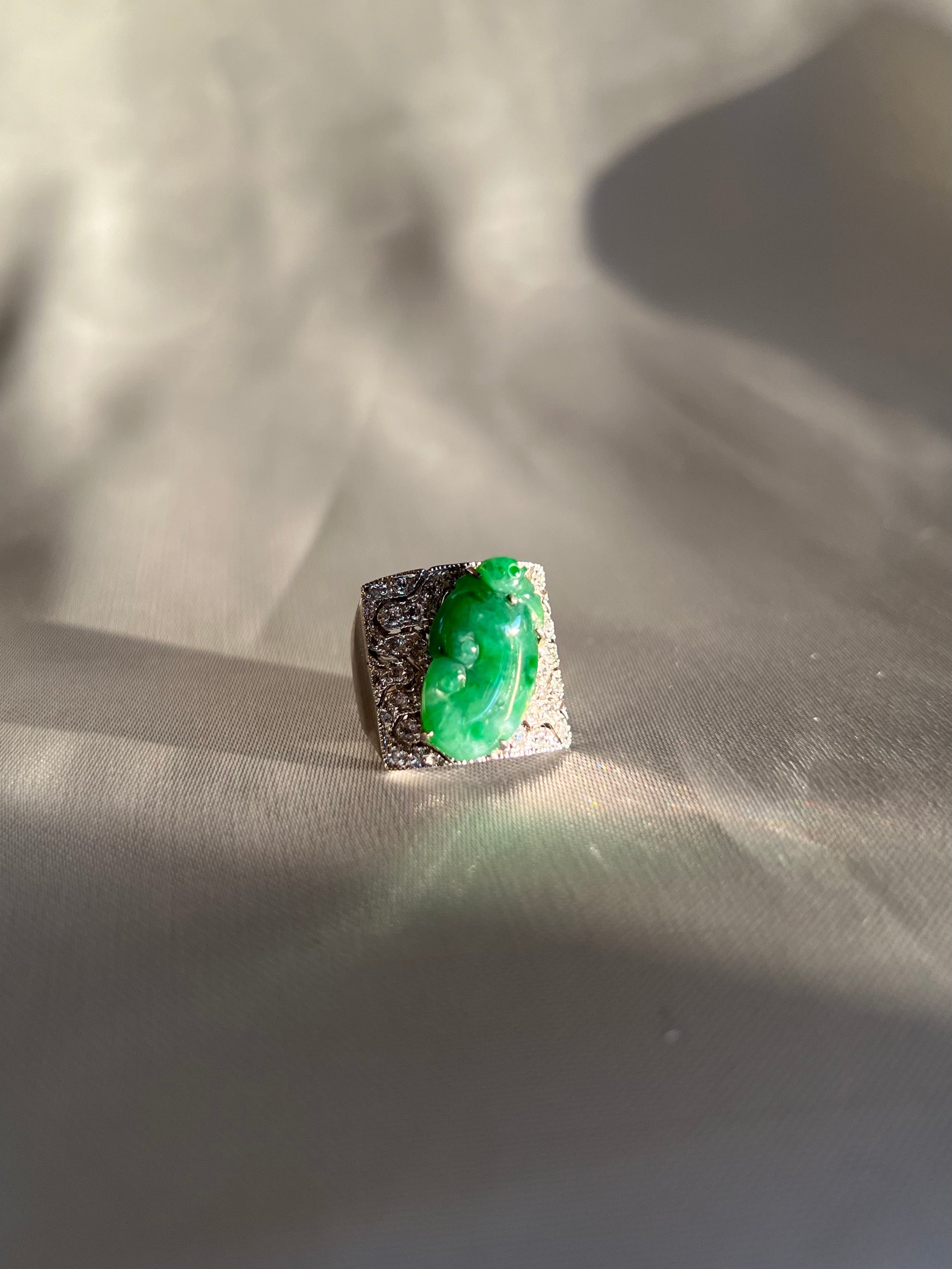 Stunning cocktail ring featuring natural jadeite jade zodiac monkey cloud carving. The jade has oil paint green and pearly luster background with vivid green floral patterns. The surface of the stone is silky smooth and highly polished. with beautiful accent diamonds dancing around.