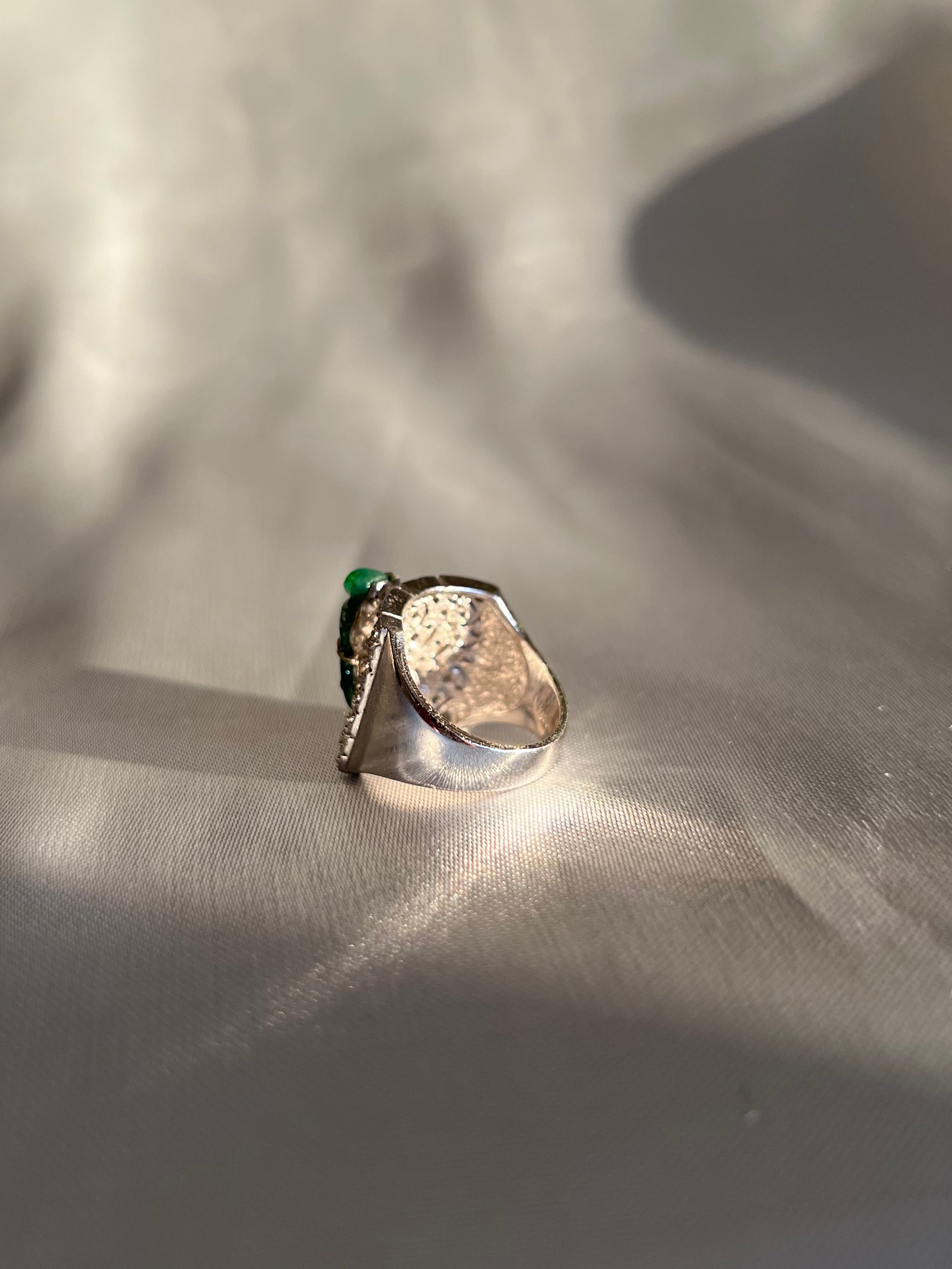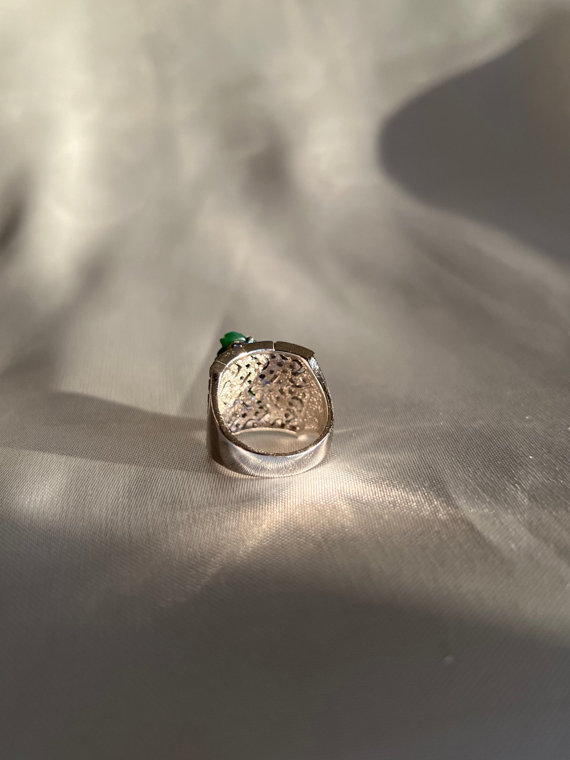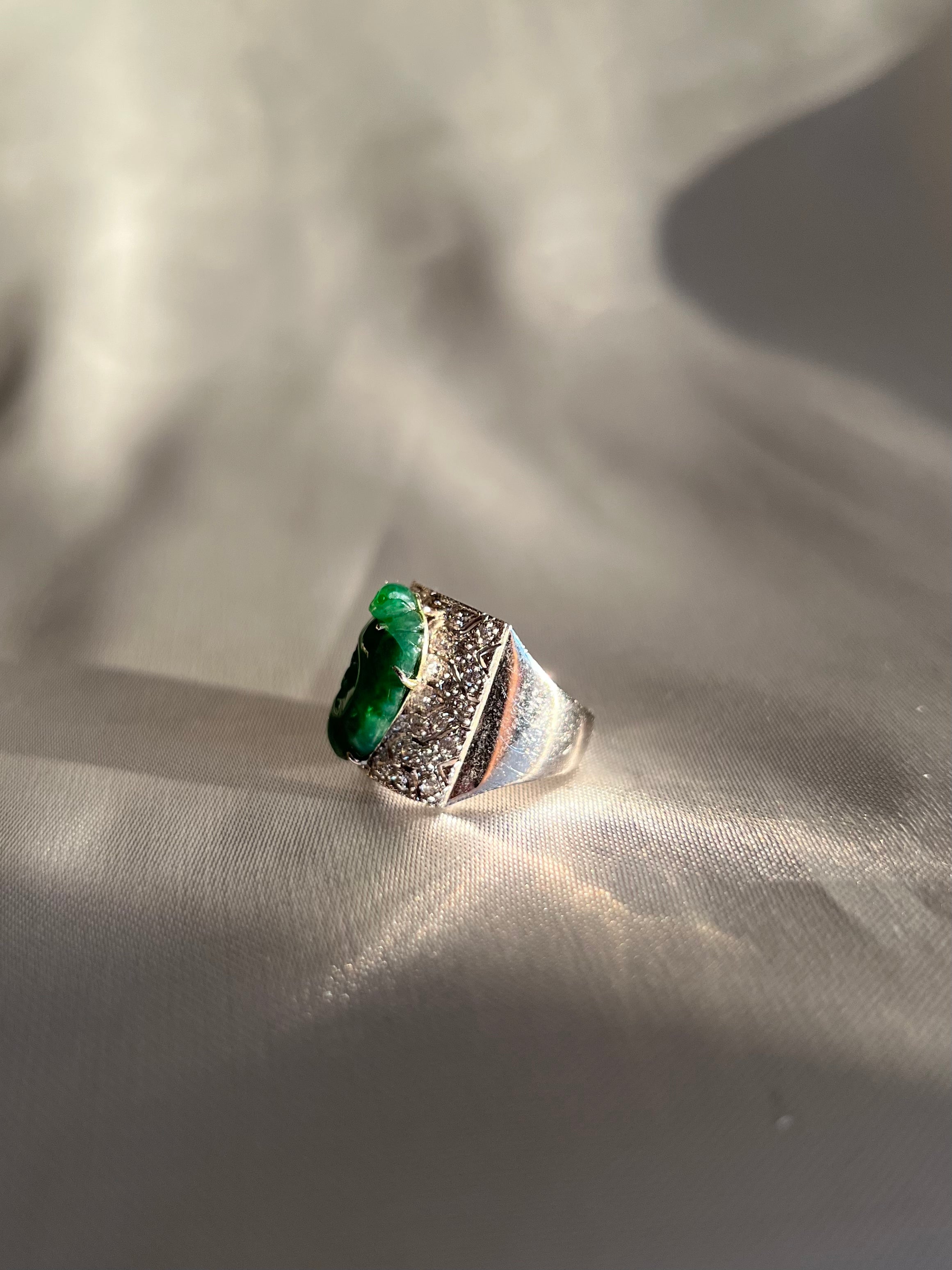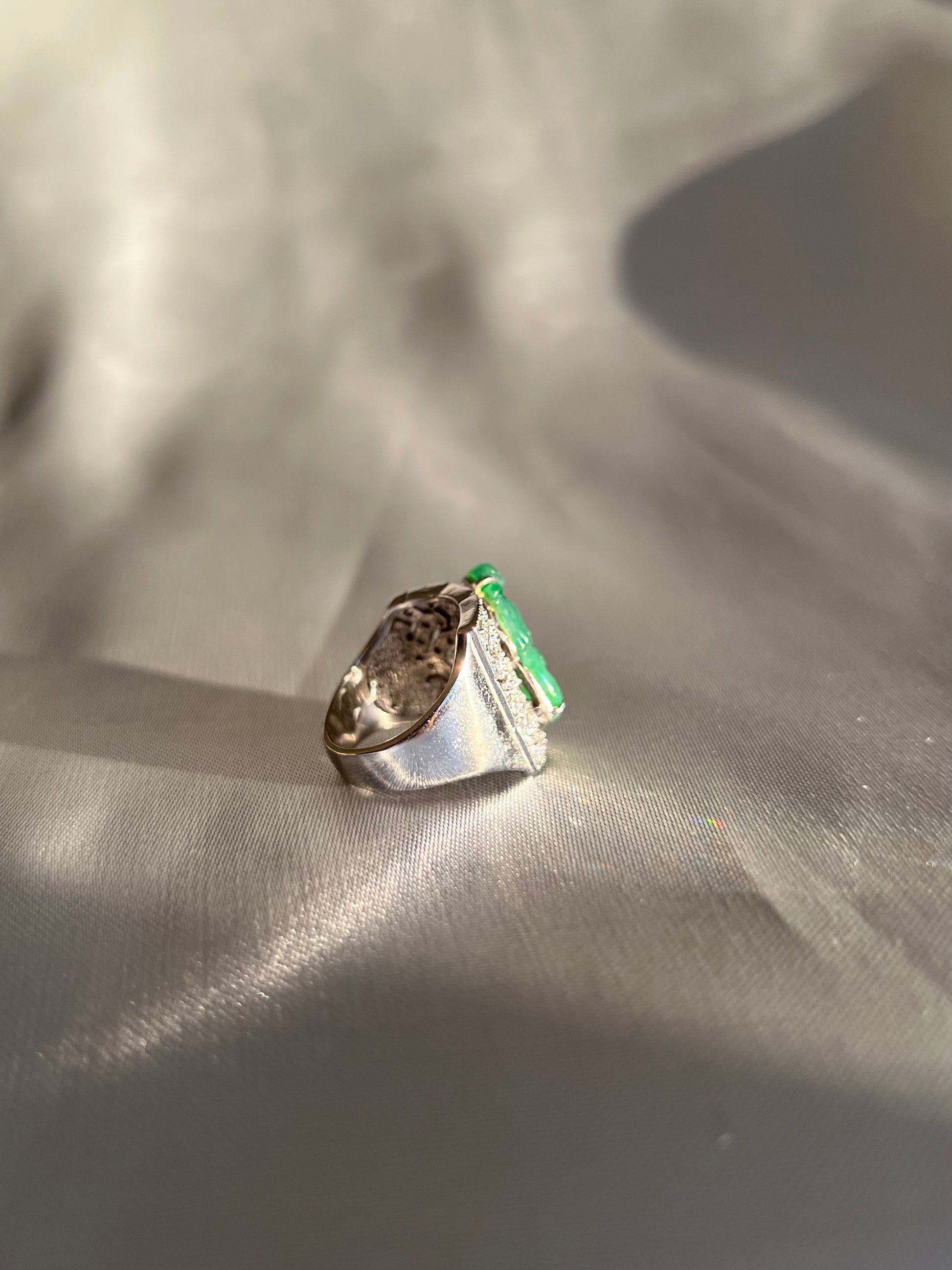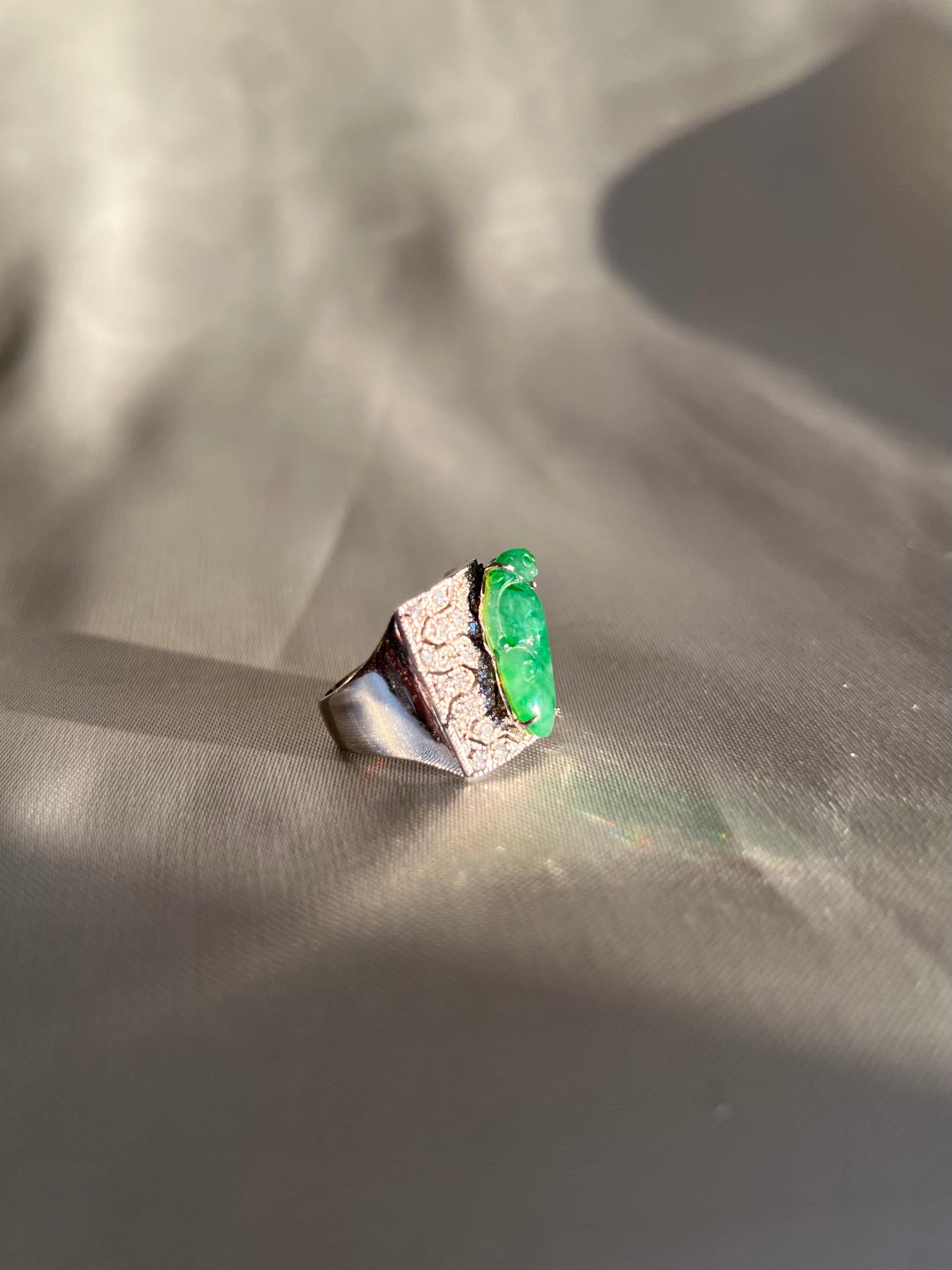 Stunning cocktail ring featuring natural jadeite jade zodiac monkey cloud carving. The jade has oil paint green and pearly luster background with vivid green floral patterns. The surface of the stone is silky smooth and highly polished. with beautiful accent diamonds dancing around.